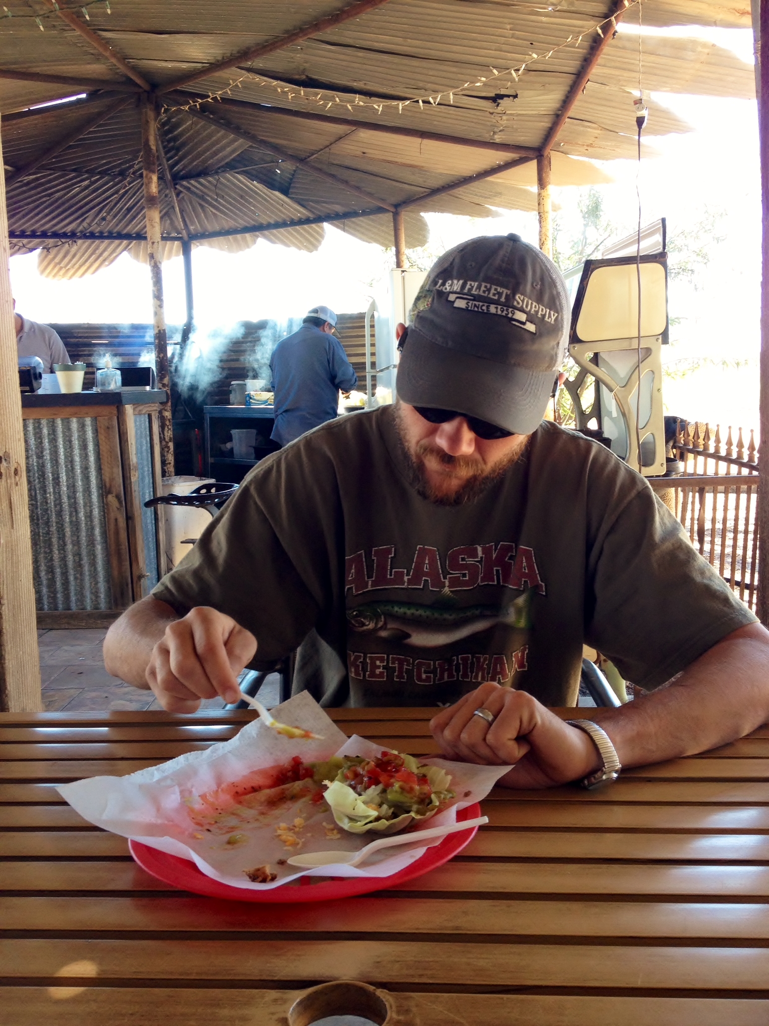 I layed on our picnic table, taking in the sounds, the smells. A raven flew by, and the beat of his wings was too loud; the lack of noise seemed to heighten my awareness. Moss grew everywhere, crawling over our firepit, the fence posts and the top of the bathrooms. Ominous is the right word. It didn’t help that we were all alone.
